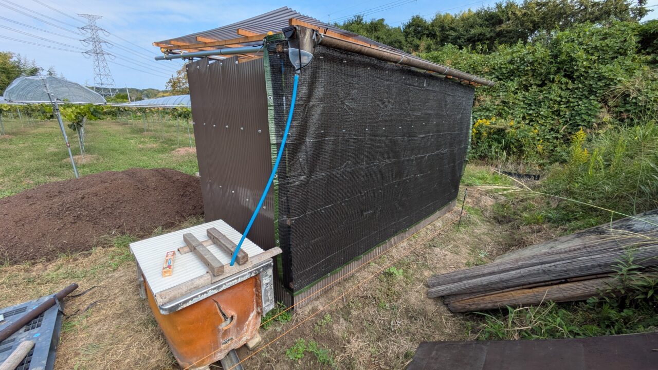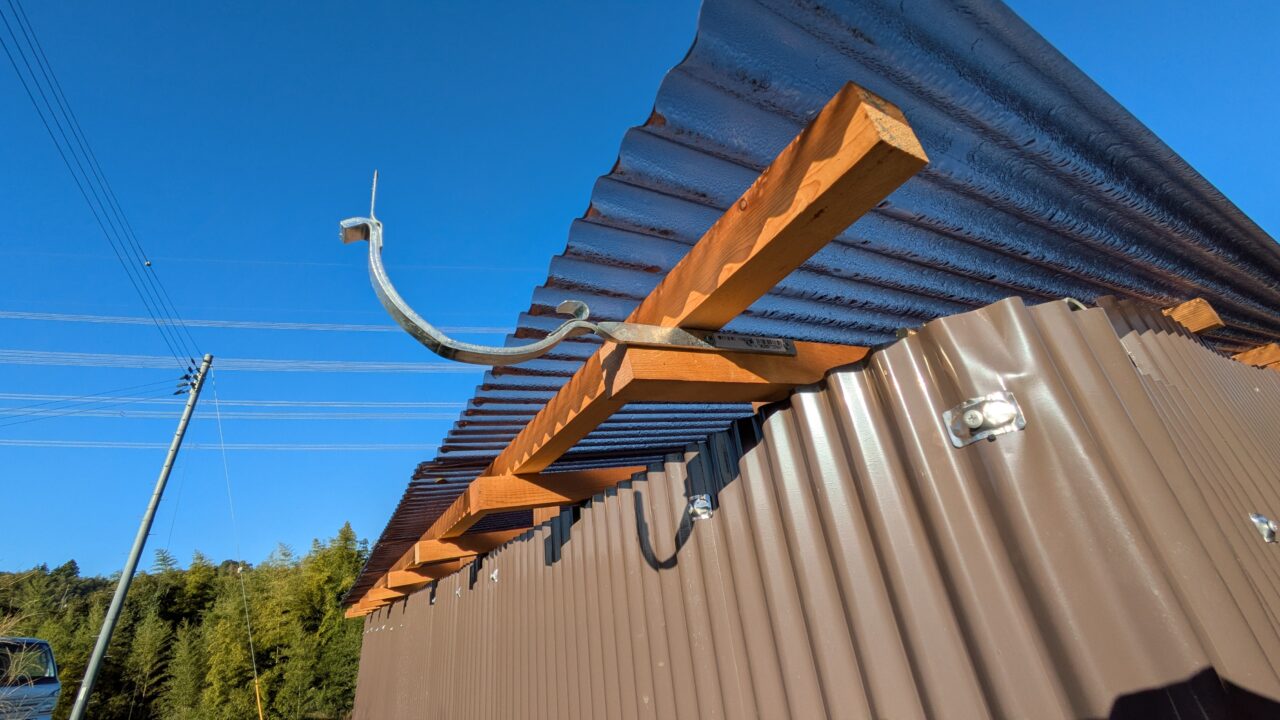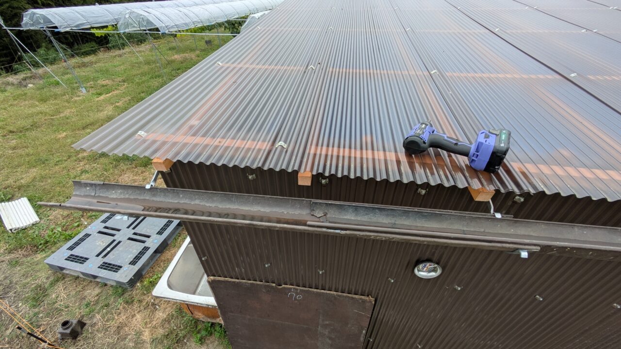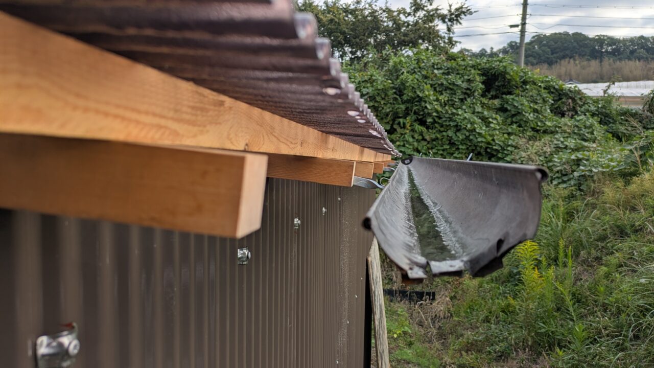 育苗ハウスに樋をつけて雨水を溜めようと思います。
