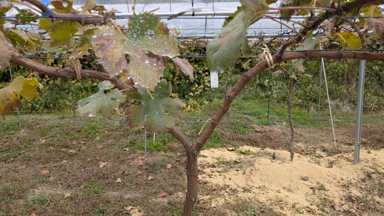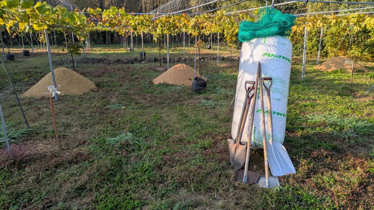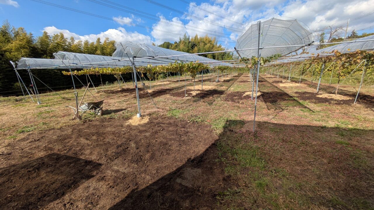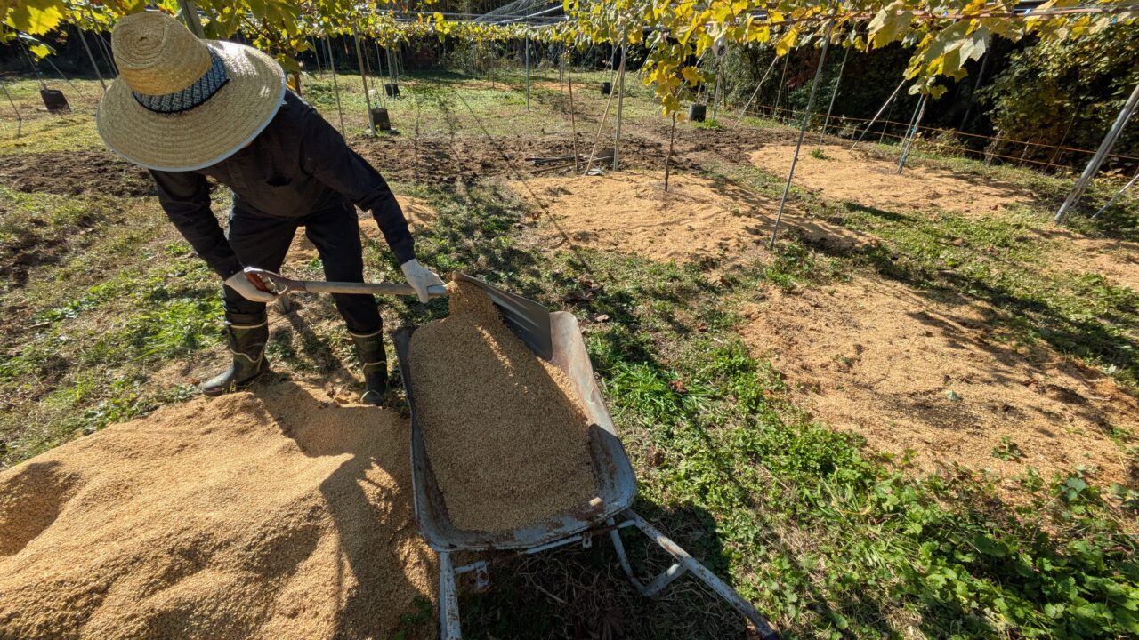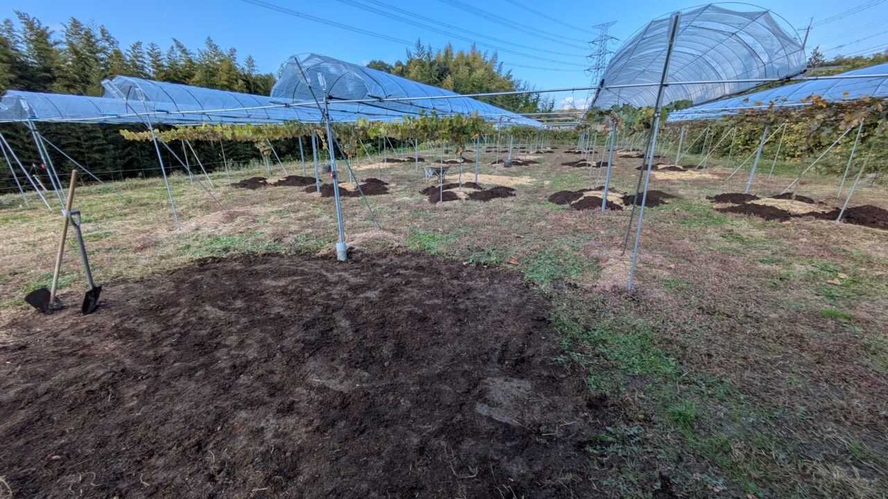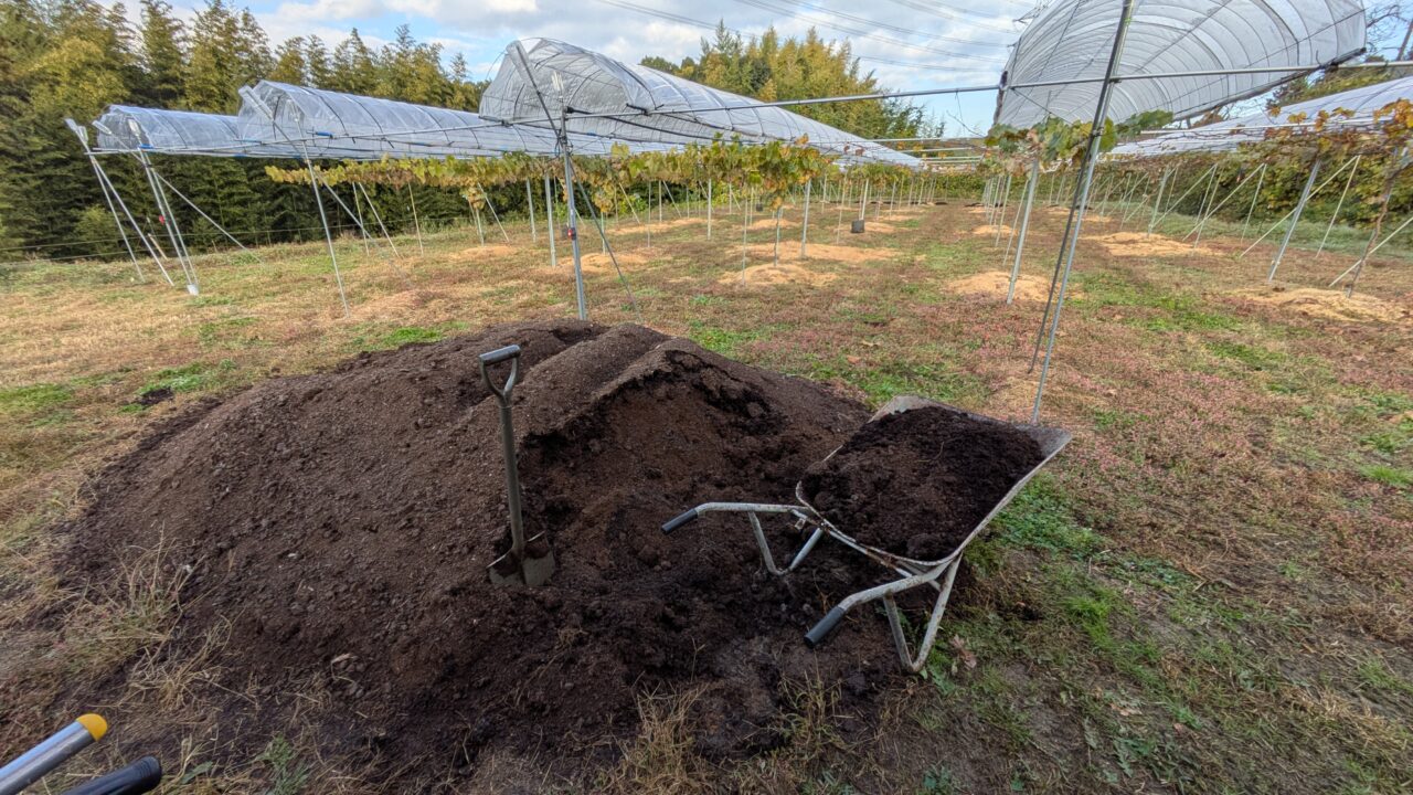 ぶどう畑に牛ふん堆肥ともみ殻を撒いて