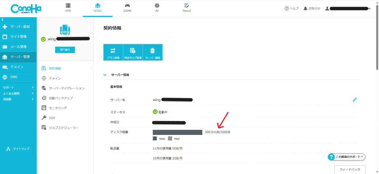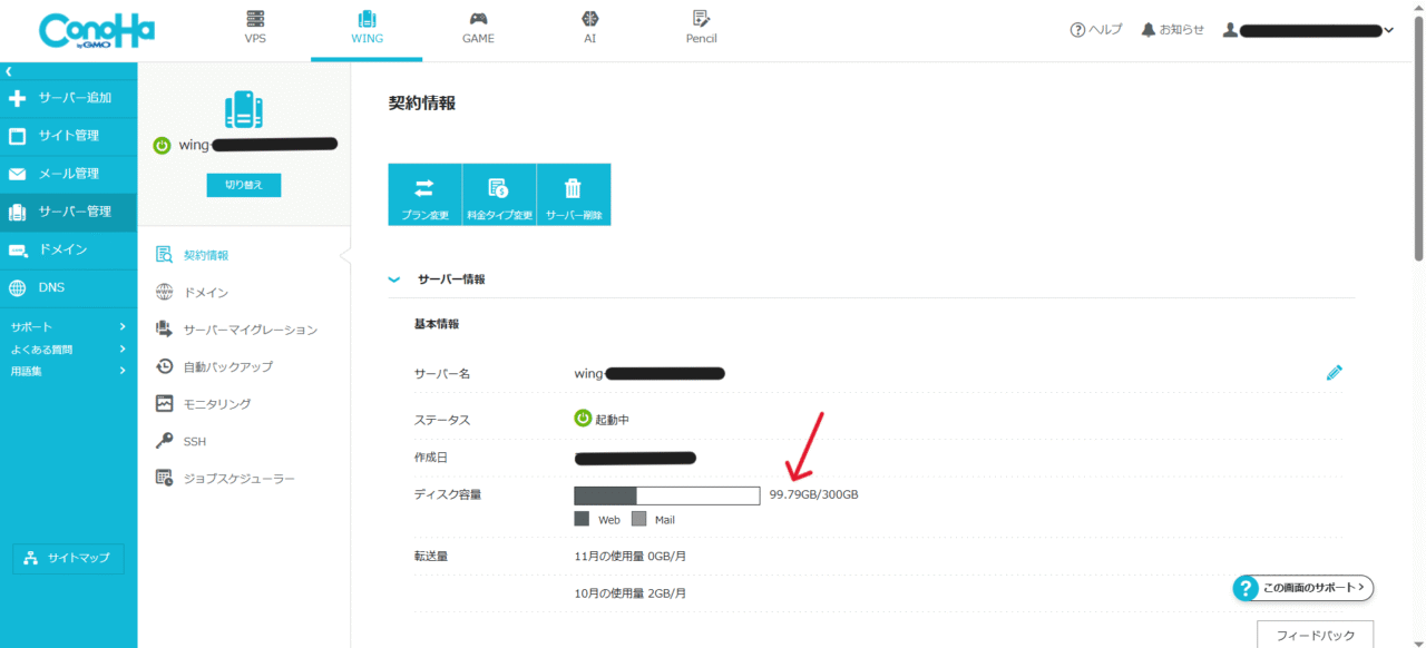 「WING」ー「サーバー管理」ー「契約情報」ー「サーバー情報」