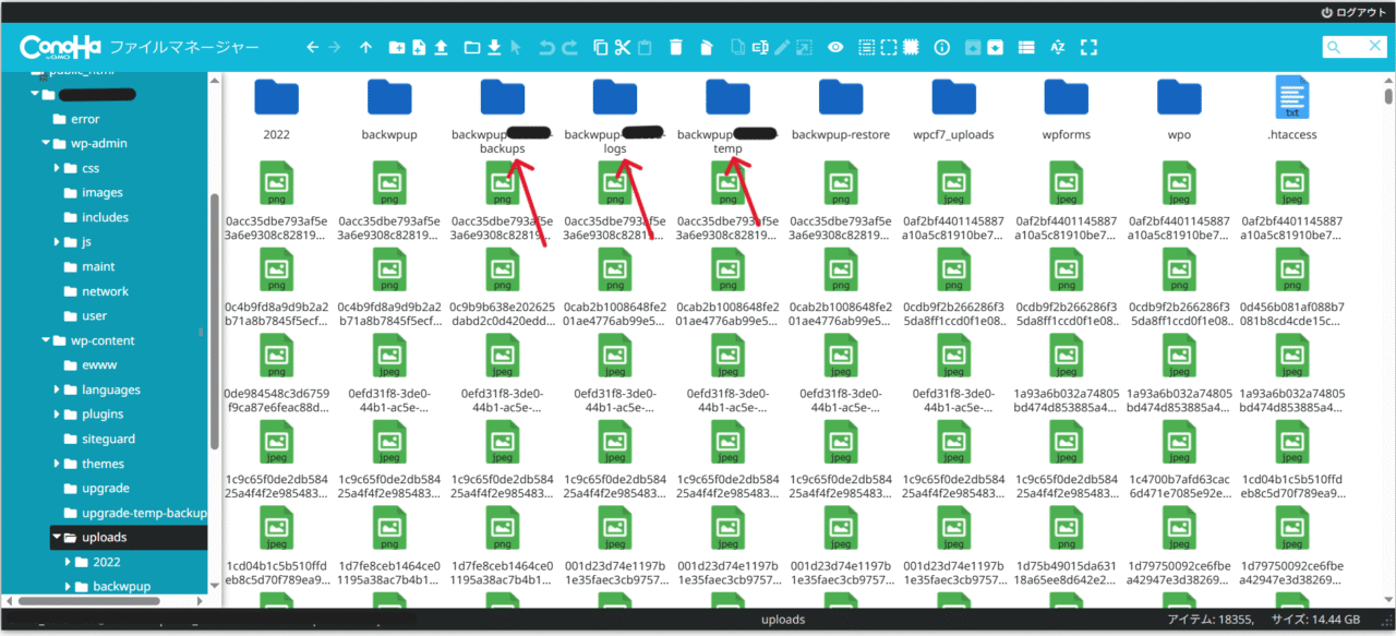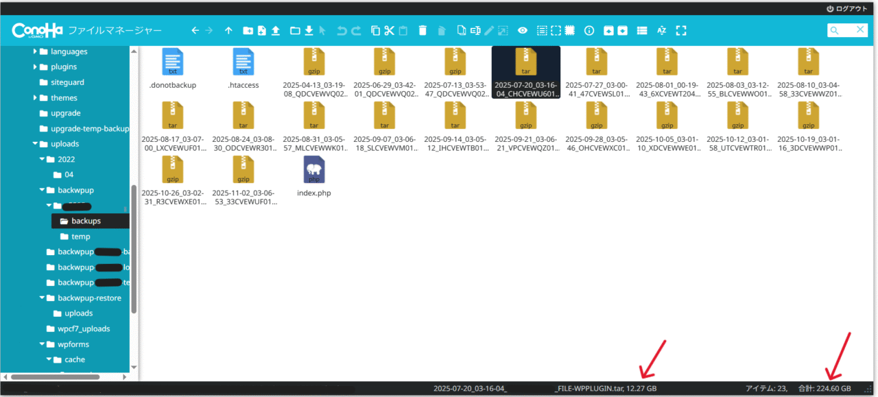 「wp-content」ー「uploads」ー「backwpup」ー「○○○○」ー「backups」